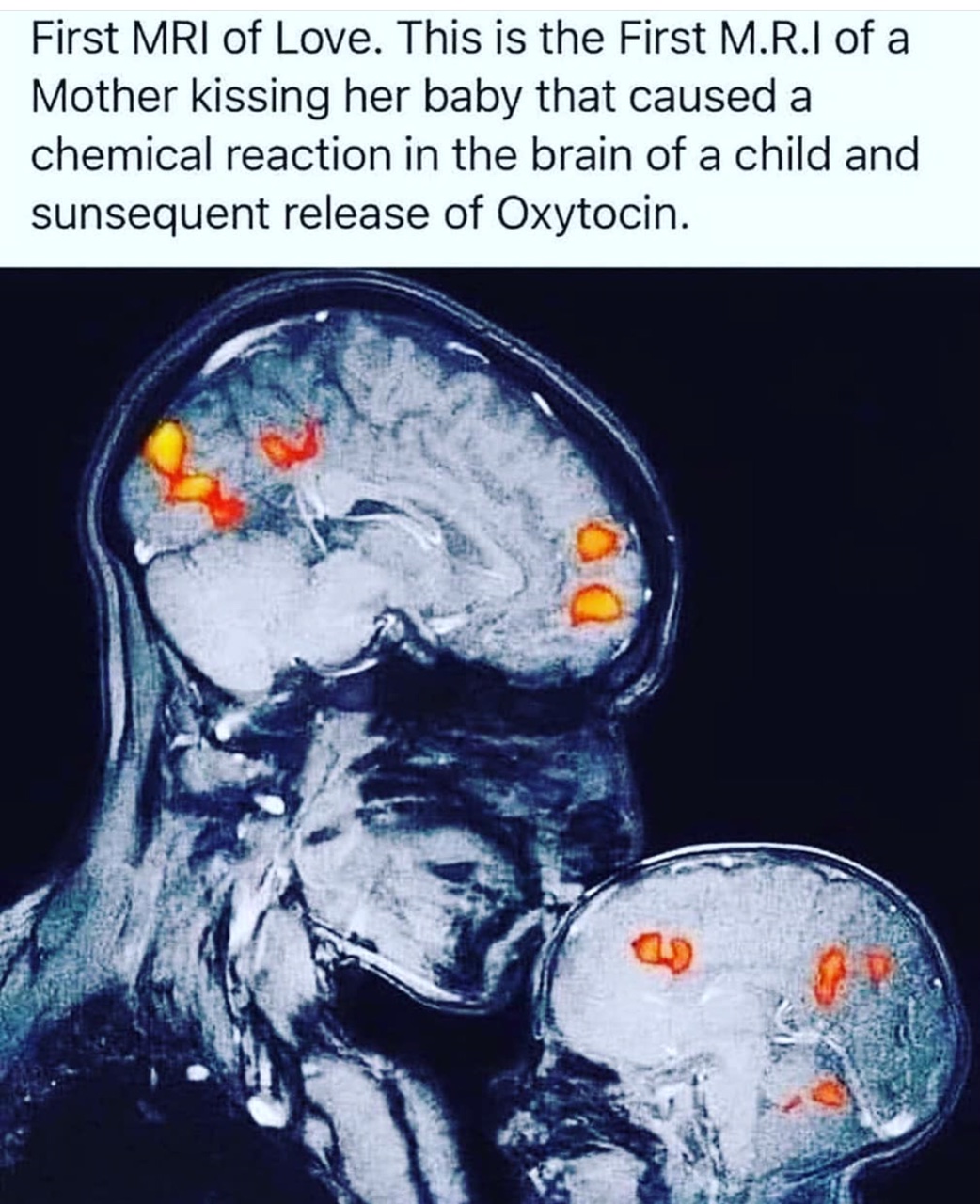 Liefde in de MRI ❤️Wat je hier ziet? Oxytocine die vrijkomt!Dit is de eerste MRI van een moeder die baar baby kust. De gebieden waar oxytocine vrijkomt worden geactiveerd.Mooi hè?Zonnig weekend gewenst! ☀️