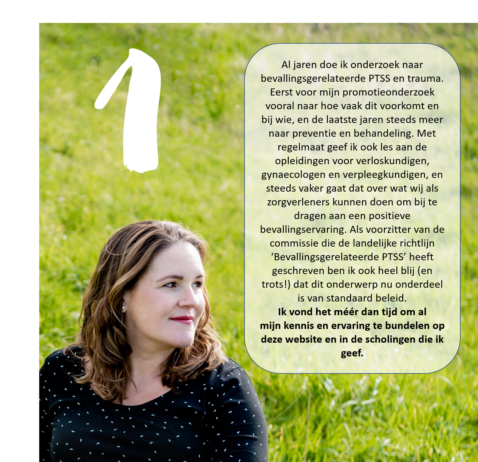 Al jaren doe ik onderzoek naar bevallingsgerelateerde PTSS en trauma. Eerst voor mijn promotieonderzoek vooral naar hoe vaak dit voorkomt en bij wie, en de laatste jaren steeds meer naar preventie en behandeling. Met regelmaat geef ik ook les aan de opleidingen voor verloskundigen, gynaecologen en verpleegkundigen, en steeds vaker gaat dat over wat wij als zorgverleners kunnen doen om bij te dragen aan een positieve bevallingservaring. Als voorzitter van de commissie die de landelijke richtlijn ‘Bevallingsgerelateerde PTSS’ heeft geschreven ben ik ook heel blij (en trots!) dat dit onderwerp nu onderdeel is van standaard beleid.